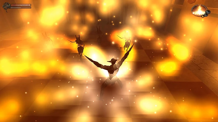 Хотя википедия называет Гнев Ангелов RPG, причин на такую жанровую принадлежность я не нашёл. Игра представляет собой экшн от третьего лица. Главный герой может орудовать мечом, а также стрелять из пистолета и арбалета. Так же есть возможность применить демонический облик, в котором изначально можно лишь драться вблизи и кидать слабенькие фаерболы, но потом можно будет открыть мощные заклинания. Для этого нужно найти светящуюся комнату, которая напоминает кадры из “Матрицы”. Я довольно долго собирал желтые светящиеся сферы, чтобы добыть самое дорогое заклинание, и не пожалел – оно показалось мне даже дисбалансным.