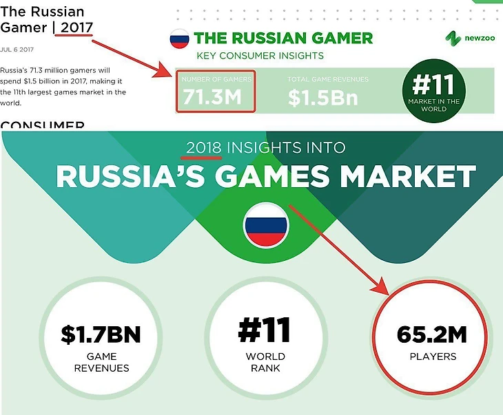 Телеграмм-канал «Отчет NewZoo» заметил забавный факт в новом материале аналитической компании. В 2017 году сотрудники NewZoo насчитали в России 71,3 млн геймеров. А в 2018 году число резко сократилось – до 65,2 млн.