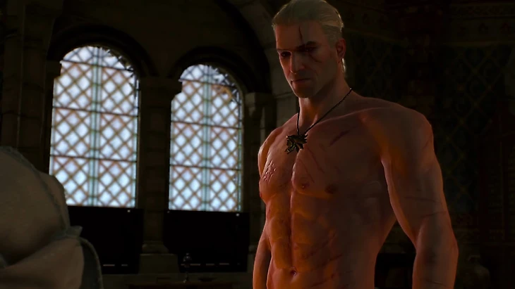 К третьей части Геральт прибавил в мышечной массе, но он не выглядит перекачанным.