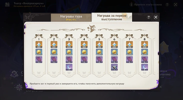 Каждый пройденный акт, вплоть до 10-го, можно получить за определенную сумму примогемов. При этом собираемые в Театре Воображариум звезды не влияют на награды, в отличие от Витой Бездны.