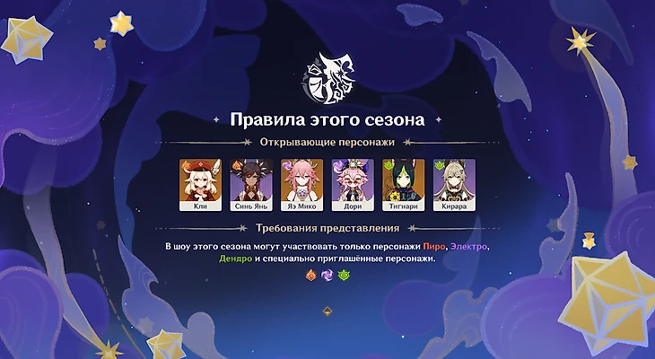 ● Элементы сезона: Пиро, Гидро, Дендро.