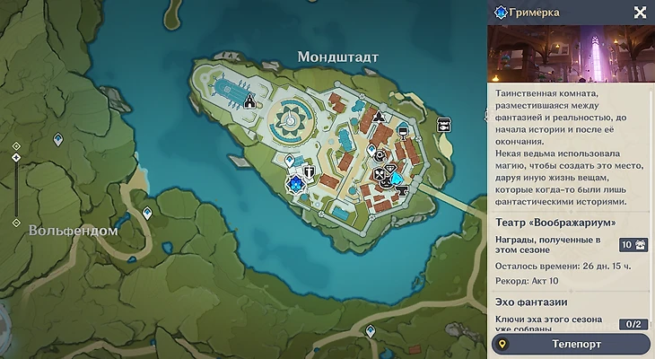 Локацию с Театром Воображариум можно найти в Мондштадте. Спускайтесь в библиотеку Ордо Фавониус и взаимодействуйте с проходом в таинственную комнату. Для этого потребуется иметь 35 ранг Приключений.