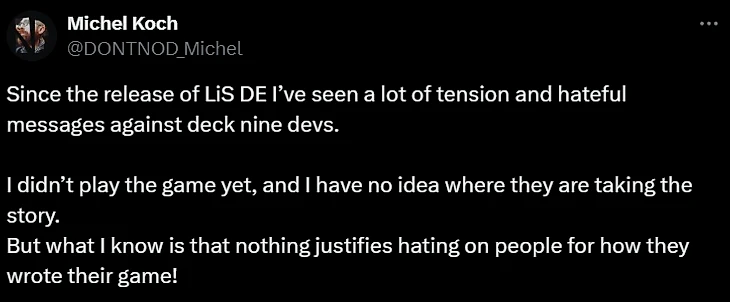 «С момента выхода Double Exposure я видел много напряженных и ненавистных сообщений в адрес разработчиков Deck Nine. Я еще не играл в игру и понятия не имею, куда они ведут историю. Но я знаю, что ничто не оправдывает ненависть к людям за то, как они написали свою игру!»