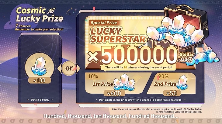 4.«Космический призыв счастливой звезды»: лотерея на 500 000 Звездного Нефрита. Продлится с 27 января по 2 февраля 2025 года. Шанс получить суперприз будет выдаваться каждый день. Можно поучаствовать либо гарантированно получить 100 Звездного Нефрита.