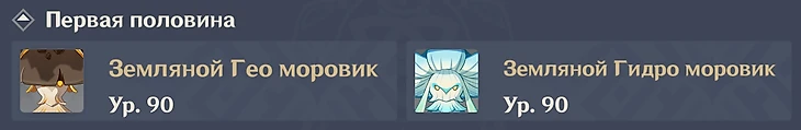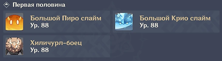 Первая половина – полчища слаймов и хиличурлов, которых лучше стянуть в одну кучу. Здесь пригодятся Венти, Кадзуха или Сахароза. Чтобы сломать щиты, возьмите Пиро и Гидро персонажей.