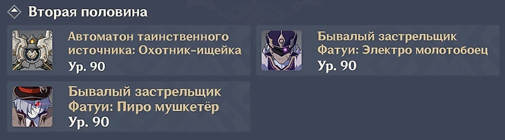 Во второй половине – Агенты Фатуи и Автоматон таинственного источника. У Фатуи есть щиты, уязвимые к элементальным тычкам – используйте Крио и Гидро героев. Автоматон больно стреляет, так что крепкий щит (Лайла, Лань Янь, Чжун Ли) или уклонения спасут вас от его ударов.