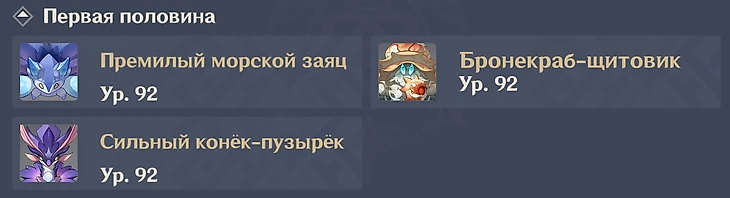 Первая половина – Премилый морской заяц, Бронекраб-щитовик и Сильный конек-пузырек. Здесь пригодится AoE-урон – например, Арлекино и Невиллет. Стяжка тоже сильно упростит задачу. Обязательно возьмите Гидро и Пиро для сбивания элементальных щитов.