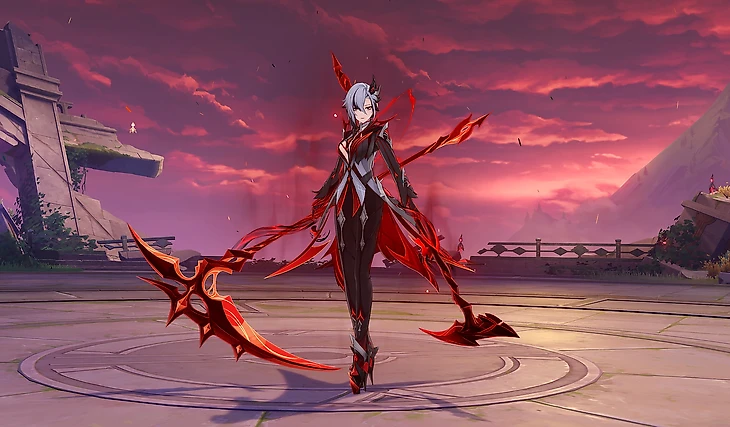 ● 5⭐ Копье Очертания алой луны. Сигнатурное оружие Арлекино, повышающее урон в зависимости от наложенного на носителя Долга жизни.