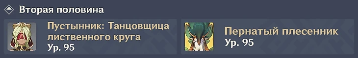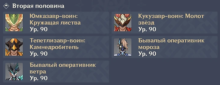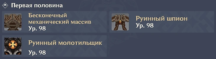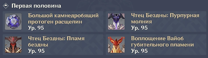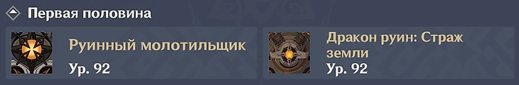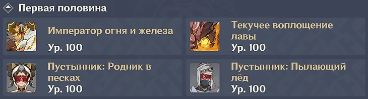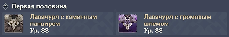 В первой половине вас ждут Каменный и Громовой Лавачурлы (по одному за волну). С каменным можно быстро расправиться Электро уроном (Клоринда, Райден) с учетом баффа этажа. Для Громового используйте Дендро (Нахида, Аль-Хайтам) или Крио (Ризли, Аяка).