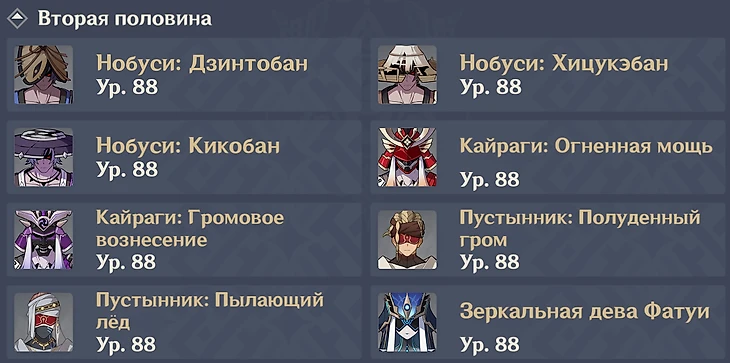 Нобуси уязвимы к стяжке (Кадзуха, Венти) – группируйте их и добивайте. Кайраги нужно убивать одновременно, иначе выживший вылечится и баффнет резисты – распределяйте урон между ними равномерно. Зеркальная дева телепортируется за вашу спину и ставит ловушки, поэтому следите за полом и держите дистанцию. Она также легко стягивается Анемо саппортами. А Пустынников можно заморозить.