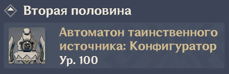 Автоматон таинственного источника – босс из Натлана. В начале боя у него повышено сопротивление ко всем элементам на 60%. Его можно снять персонажем с механикой Ночного Духа – то есть, героем из Натлана, – заполнив соответствующую шкалу под индикатором здоровья.
