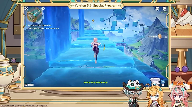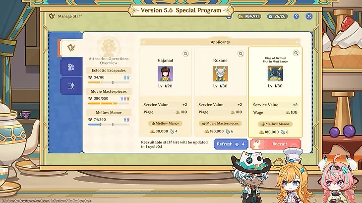 Главное событие версии 5.6 – симуляция управления парком развлечений в Фонтейне, созданным Навией и Спина-ди-Росула. Оророн и Ифа привозят товары из Натлана, но планы нарушает инцидент с контрабандой, в который вовлечен Кинич и Ризли. Какуку нарушает запрет на полеты в Фонтейне и влетает во Дворец Мермония. Невиллет и Ризли помогают его спасти.