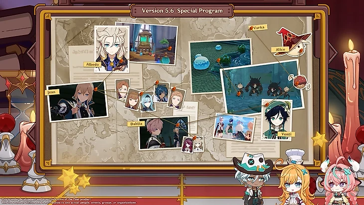 В сюжете присутствуют Джинн, Кэйя, Венти, Эола и другие персонажи региона. Впервые покажут Далию – дьякона из церкви Фавония и проповедника Барбатоса.