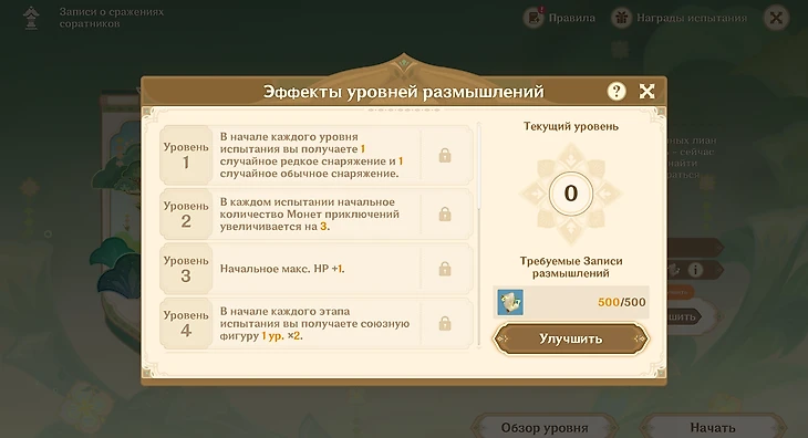 В меню ивента можно повысить уровень размышлений – баффы, которые позволяют получить определенные бонусы автоматом: снаряжение, дополнительное ХП и так далее.