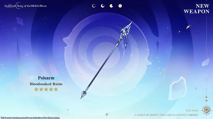 ● 5⭐ Копье «Окровавленные руины» – сигнатурное оружие Флинса. Повышает шанс критического попадания. После использования ультимейта урон Лунного заряда увеличивается. Если проводить эту реакцию, союзники получают прирост критического урона и восполняют энергию.