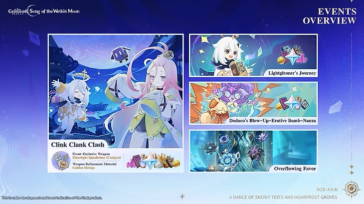 ● Великая битва Додоко: дополнительное событие в Мондштадте, которое пройдет с 29 сентября по 13 октября. В нем нужно устанавливать и взрывать бомбы с помощью Додоко, отпугивать рыб и сражаться с боссами, зарабатывая очки для обмена на награды.