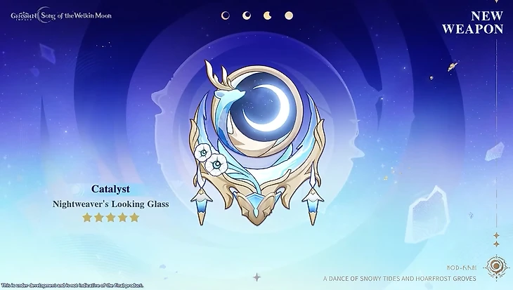 ● 5⭐ Катализатор «Зеркало прядильщицы ночи» – сигнатурное оружие Лаумы. Повышает мастерство стихий. Когда рядом активируют Лунную бутонизацию, герой получает эффект Растущей Луны, увеличивающий мастерство стихий. При нанесении урона элементальными навыками Гидро или Дендро получает бафф Убывающей Луны, также усиливающий мастерство стихий. Если работают оба эффекта одновременно, активируется Лунный цикл, который повышает урон от обычных атак, Лунной бутонизации, Вегетации и Цветения для всей команды.