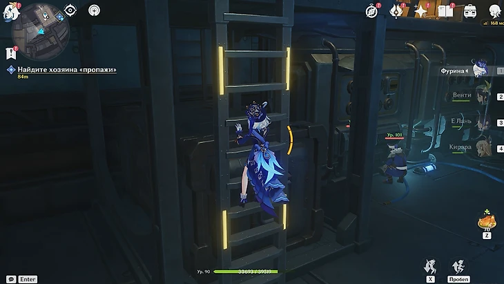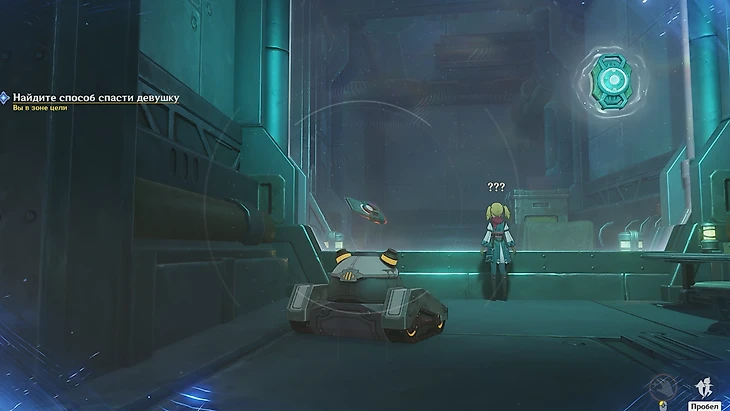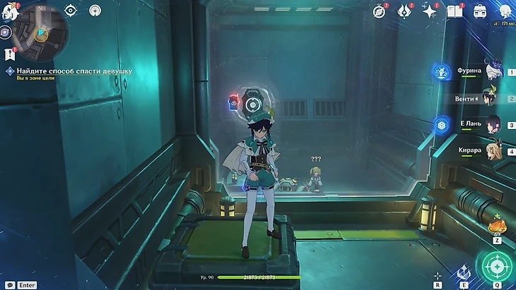 Наверху вы увидите двух работников Фатуи и девушку Азалию. После короткого диалога подойдите к терминалу и вызовите второй контейнер. Заберитесь внутрь, чтобы начать основную часть квеста.
