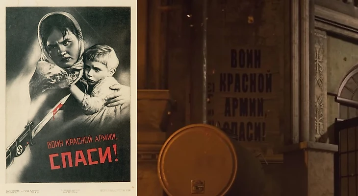 Вернемся немного назад. На стене одного из домов есть бумага с лозунгом «Воин Красной армии, спаси!». Этот лозунг придуман не из головы, он взят с одного из самых известных плакатов времен войны: