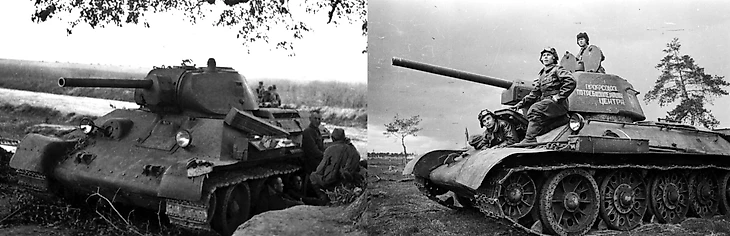 Конкретно эта модификация Т-34-85 производилась с зимы 1944 года (в конце 1943 года в танк ставилось орудие Д-5Т). Летом 1942 года не велось даже проектных работ по созданию Т-34 с 85-милимметровой пушкой, а в восках были лишь Т-34 с 76-милимметровым орудием с двумя вариантами башни – меньшая по размерам и менее удобная для экипажа образца 40-го года (слева), а также расширенная образца 42-го года (справа):