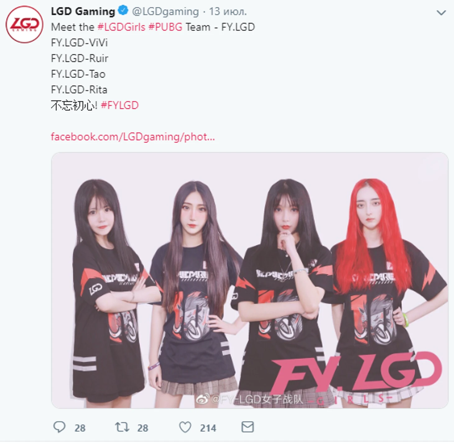 Анонс женского состава по PUBG китайской организации «LGD» в Twitter