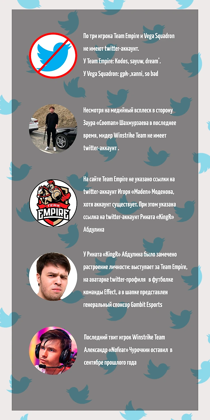 Стоит отметить, что несмотря на всю «уютность» Twitter для киберспортсменов, в СНГ сообществе есть игроки, которые twitter-аккаунта не имеют вообще.