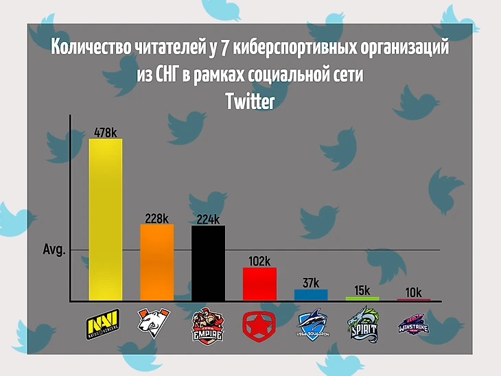 В данном блоге рассматривается социальная сеть Twitter через призму 7 киберспортивных организаций из СНГ: «Natus Vincere», «Virtus Pro», «Winstrike Team», «Gambit Esports», «Team Empire», «Team Spirit» и «Vega Squadron». В предыдущем блоге мы узнали, что аудитория данных организаций в рамках Twitter несколько меньше, чем «Вконтакте». Так же здесь меняется картина относительно читателей (а именно так в Twitter называются подписчики).