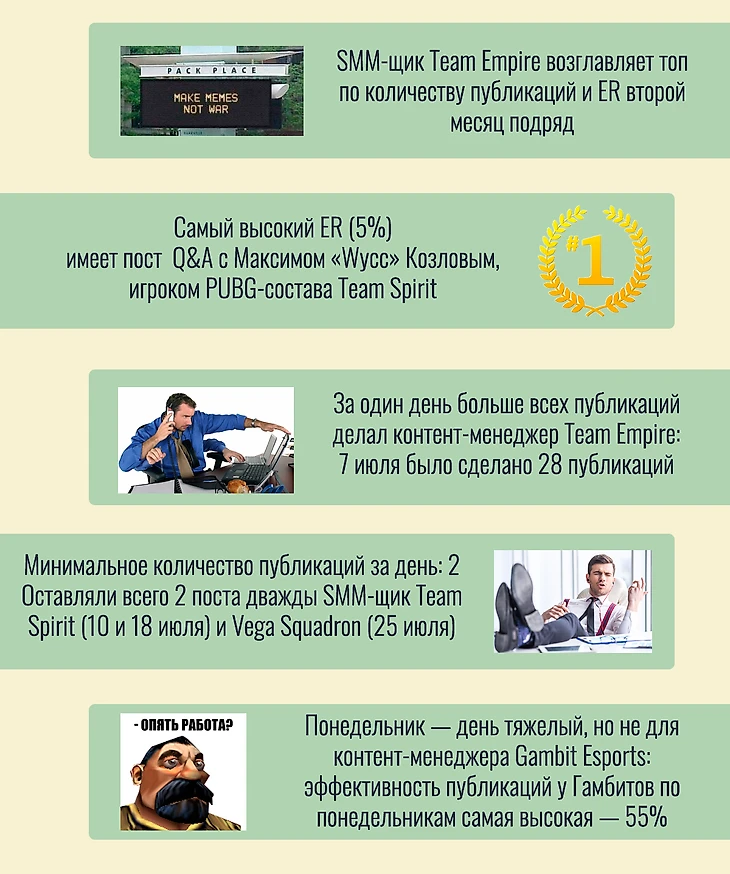 И здесь Team Empire возглавляет рейтинг второй месяц подряд. Сразу видно насколько соскучились болельщики Natus Vincere по победам в Dota: разница в ER за июль, и июнь составила 35%. Порадовали Winstrike Team, у которых в прошлом месяце с данной метрикой были проблемы на фоне остальных. А вот SMM-щик Vega Squadron явно работает под девизом: "Главное не количество, а качество" и занимает второе место второй месяц подряд. Контент-менеджер Virtus.Pro тоже явно не сидит сложа руки: за месяц ER публикаций вырос на 27,42% и это с учетом того, что «медведи» не участвовали в главном инфо поводе июля: закрытых квалификациях на The International.