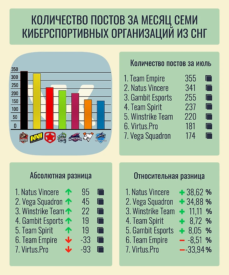 Инфографика количества постов за июль семи киберспортивных организаций из СНГ
