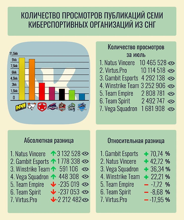 Инфографика количества просмотров публикаций семи киберспортивных организаций из СНГ