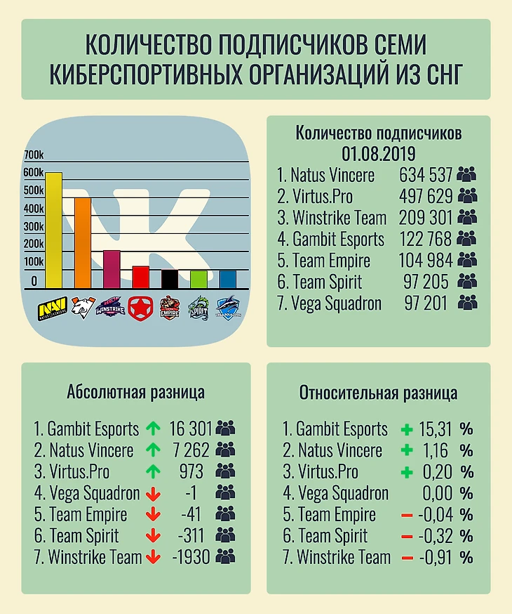 Инфографика количества подписчиков семи киберспортивных организаций из СНГ в официальных сообществах ВКонтакте за июль