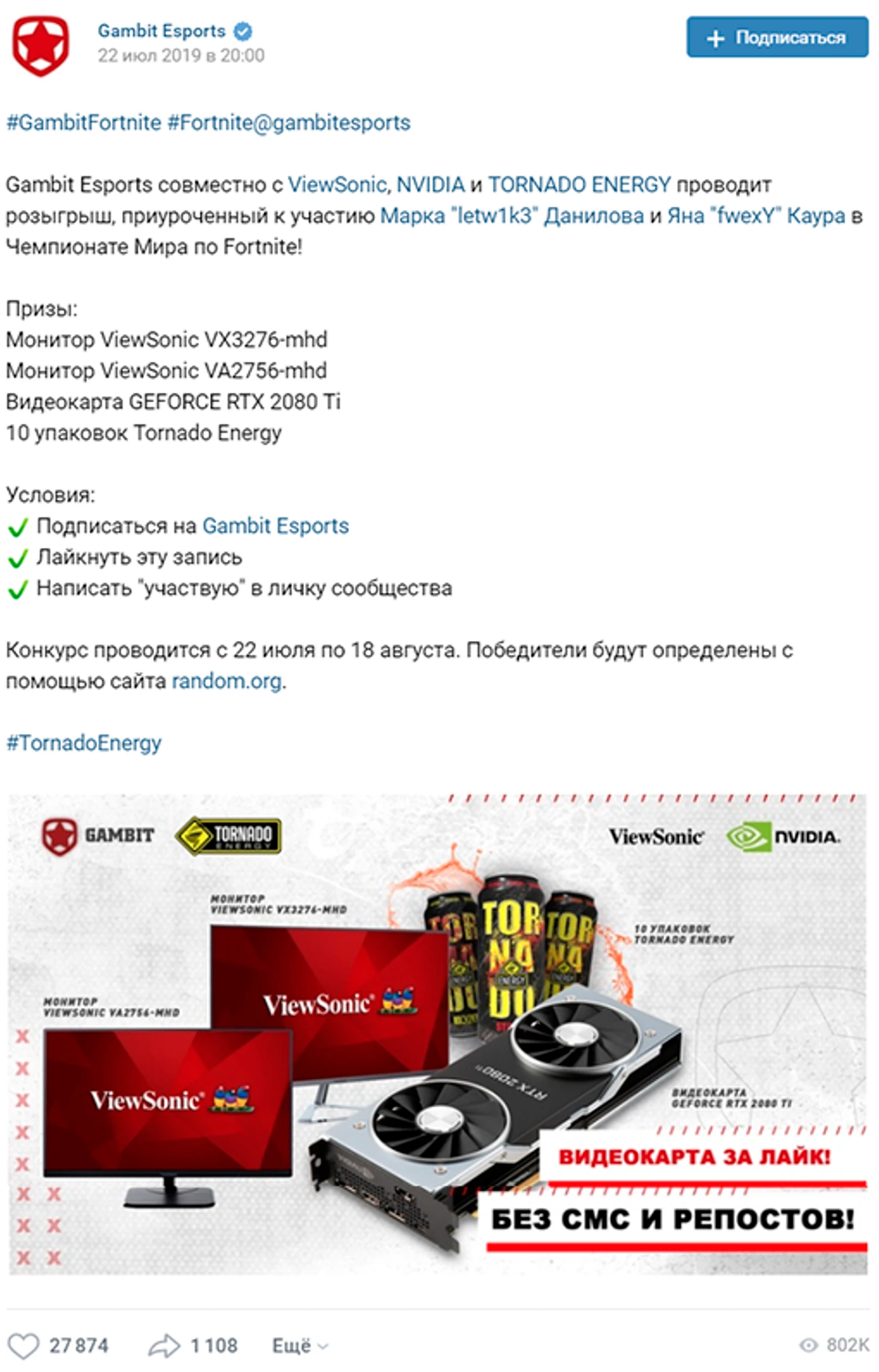 А никакого секрета нет: 22 июля Gambit Esports просто организовали классический розыгрыш. Вы только посмотрите на это количество просмотров! Теперь то понятно, откуда такой большой прирост подписчиков у организации. Кстати, принять участие в розыгрыше можно до 18 августа, так что пока еще можно запрыгнуть в этот «поезд невиданной щедрости». Классический, но при этом действенный способ найти новую аудиторию — отличное решение для медиа отдела Gambit Esports. Остается наблюдать, как они будут удерживать такой большой поток новой аудитории.