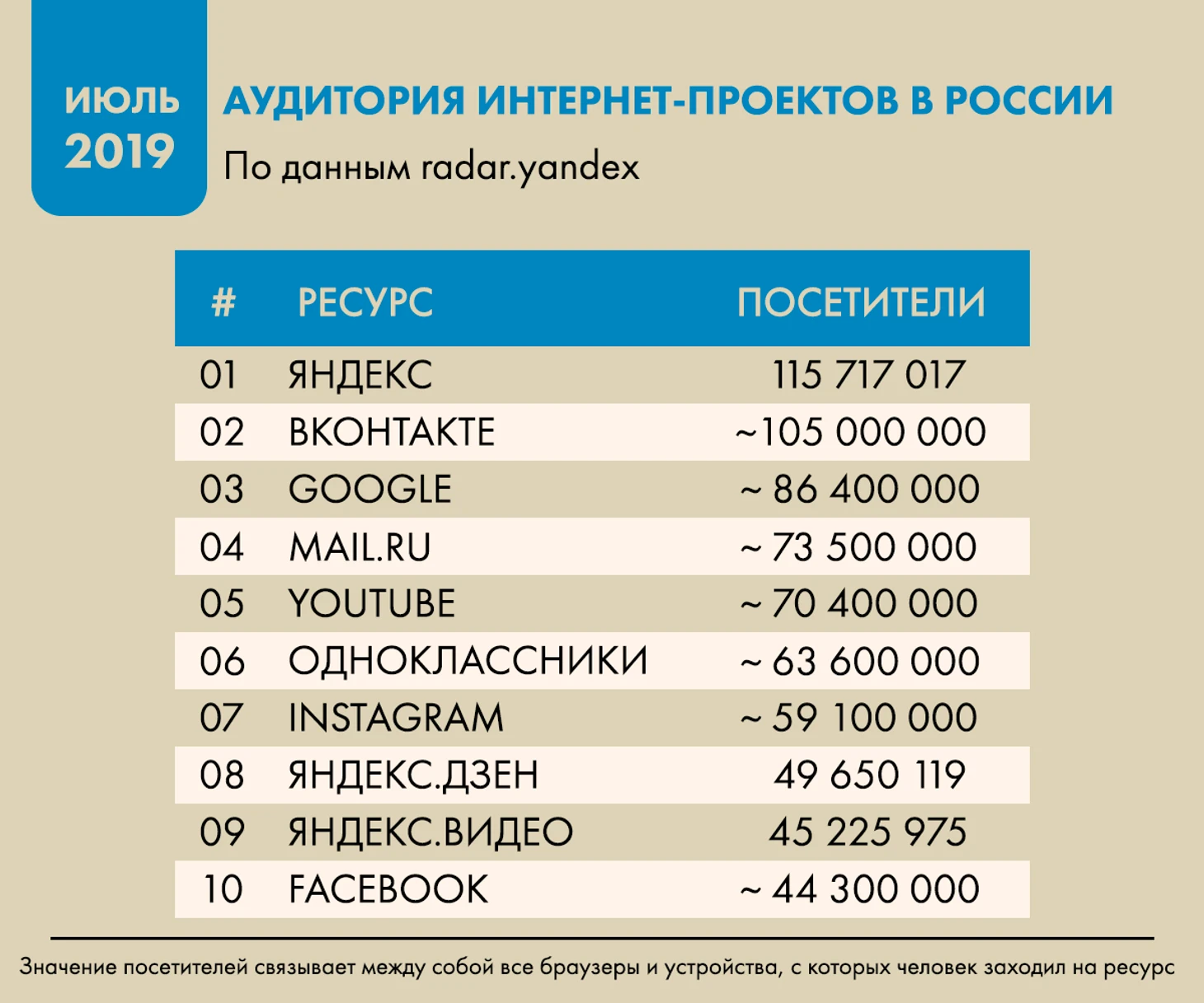 Согласно статистике radar.yandex, «Дзен» занимает 8 строчку в рейтинге интернет-проектов в России в июле 2019 года. Стоит отметить, что Аудитория «Дзена» в России больше, чем у Facebook. Но кто же все эти почти 50 миллионов человек?