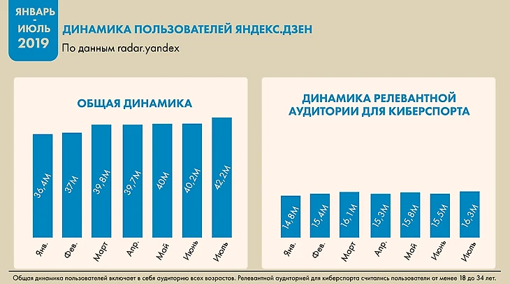 Из графика видно, что общая динамика имеет тенденцию роста: за первое полугодие аудитория «Дзена» выросла на 13,8%. Релевантная аудитория для киберспорта имеет более скромные показатели: количество пользователей в возрасте от 18 до 34 лет увеличилось лишь на 9,7% за первое полугодие 2019 года, к тому же, в отличие от общей динамики, данная возрастная выборка имела некоторую нестабильность.