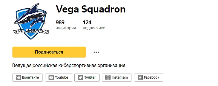 В отличие от Virtus.Pro, первая публикация Vega Squadron на «Дзене» датируется 2 ноября 2017 года. За почти два года существования канала вышло всего 42 публикации. Видно, что редактор «акул» забивал на «Дзен», но в последнее время статьи стали выходить чаще. Вега постаралась лучше всех: стоит актуальный логотип команды на аватарке и даже указаны все социальные сети.
