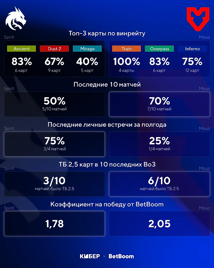Команды близки по силам. Mouz частенько играет полноценные Во3, в истории противостояния команд таких матчей тоже много. Ждем повторения.