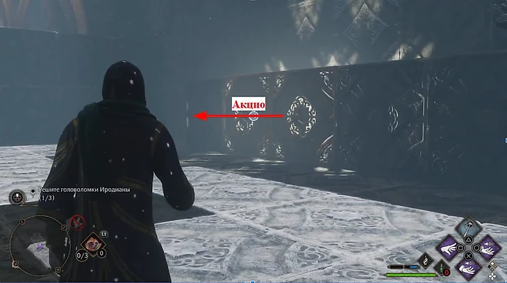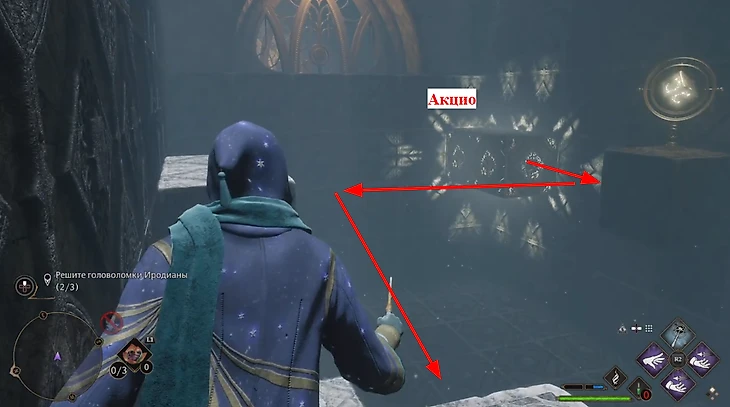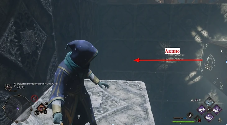 2. Пройдите направо и потяните нижние кубы на себя с помощью «Акцио». Теперь вы можете выйти из комнаты и забрать награду – «Костюм Иродианы».