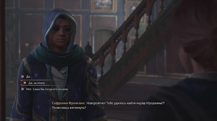 Для завершения квеста нужно вернуться к Софронии Франклин. Девушка попросит показать ей наряд Иродианы Бирн. Игрок может выбрать одну из трех фраз: показать одеяние, показать одеяние за плату или отказать в просьбе.