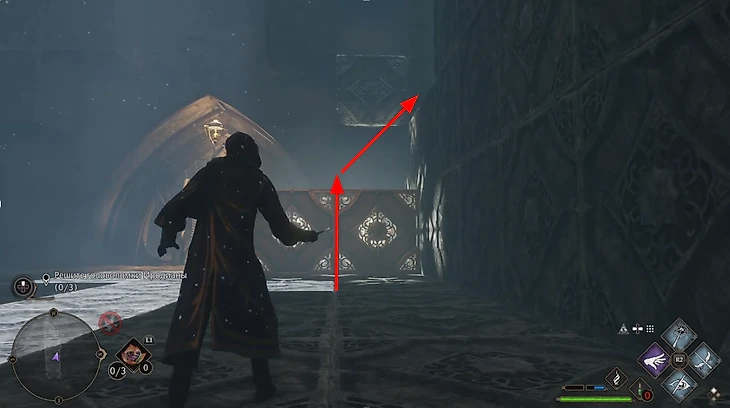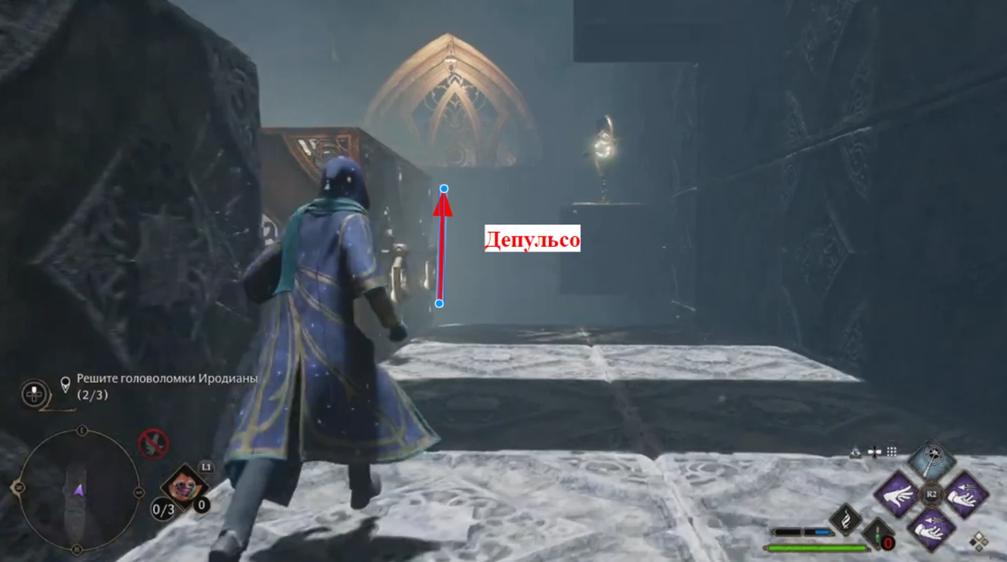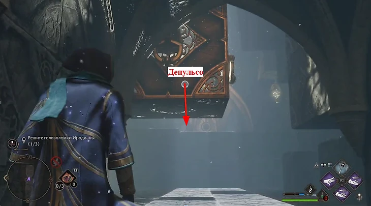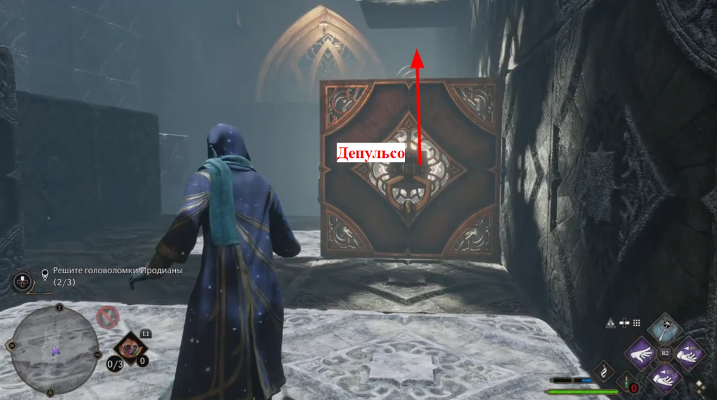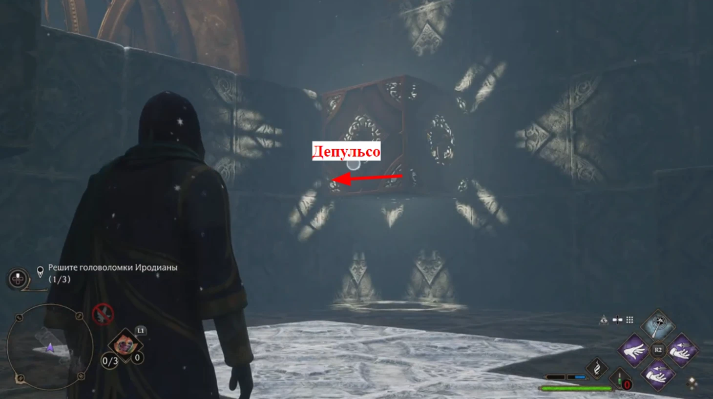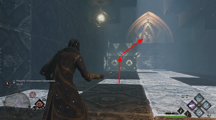 Через несколько пролетов вы увидите стену со странным механизмом – за ней скрыт вход в «Зал Иродианы». Чтобы войти в магическое помещение, примените к стене с механизмом заклинание «Депульсо». Внутри вам предстоит пройти три комнаты с головоломки.