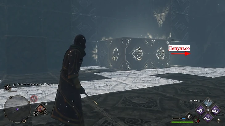 В центре первой комнаты вы увидите два объединенных куба. Вначале обойдите их справа и используйте «Депульсо», чтобы подвинуть их к левой стене.