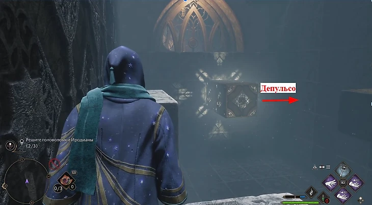 2. Заберитесь наверх, прыгните к левой стене и затем с помощью «Депульсо» переместите блок вправо.