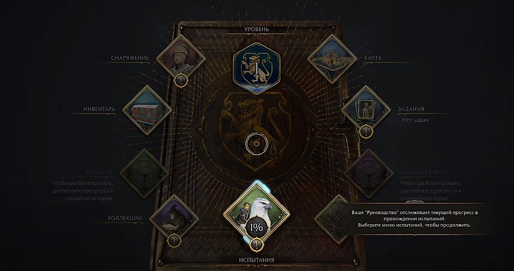 Важно: «Руководство для волшебников» – ключевой элемент игры. В нем собрана информация о вашем прогрессе, основных и побочных заданиях, исследовании Хогвартса, нахождении секретов, прокачка способностей и т.д. По факту «Руководство» – основное меню игры.