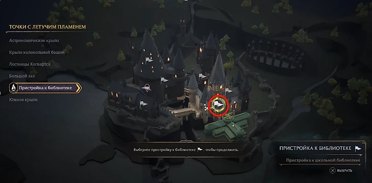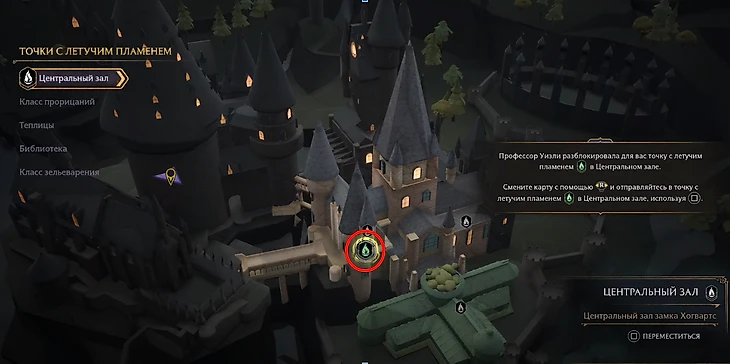 Откройте карту Хогвартса и выберете вначале локацию Пристройка к библиотеке, а затем точку с летучим пламенем «Центральный зал».