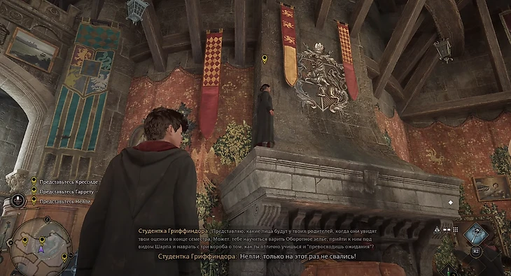 В гостиной нужно поговорить с тремя студентами вашего факультета. Над головой у каждого есть желтый маркер. В диалогах можно выбирать любой из вариантов ответов – ваши фразы не повлияют на сюжет или отношение к вам других персонажей.
