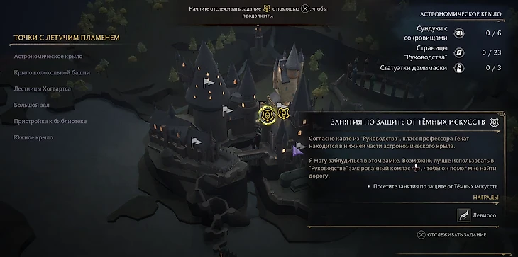 После вас перенесет в меню «Руководства», где вы можете увидеть ваш прогресс в исследовании Хогвартса.