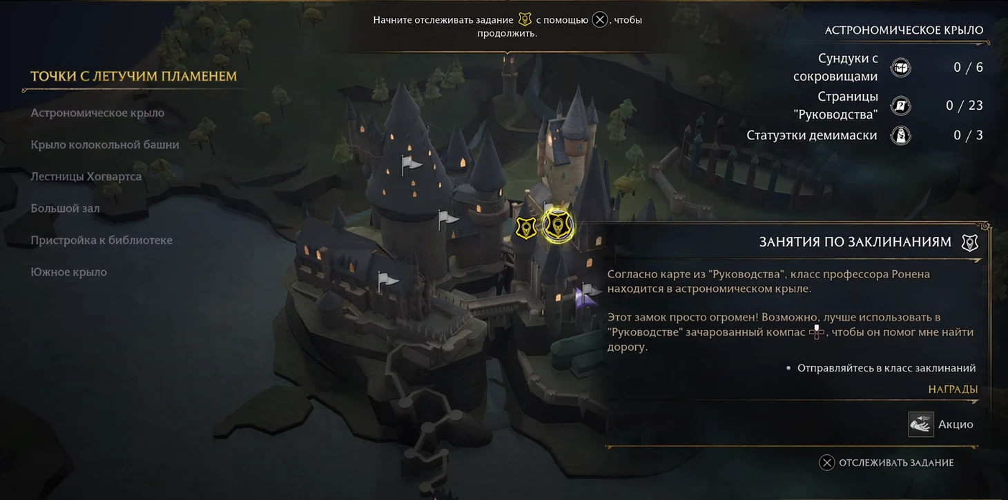 Чтобы начать выполнение квеста, доберитесь до класса «Заклинаний», который расположен в Астрономическом крыле. Вы можете воспользоваться точкой с летучим пламенем «Класс Заклинаний», но поскольку выполнение квеста, скорее всего, будет первым посещением этой области, нажмите «отслеживать задание» на карте и следуйте за тонкой желтой линией от Зачарованного компаса.