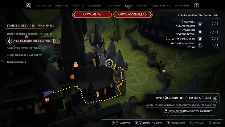 Занятия проходят на лужайке в локации Крыло Колокольной башни. Воспользуйтесь точкой с летучим пламенем «Лужайка для полета на метлах» или нажмите «отслеживать задание» на карте и следуйте за тонкой желтой линией от Зачарованного компаса.