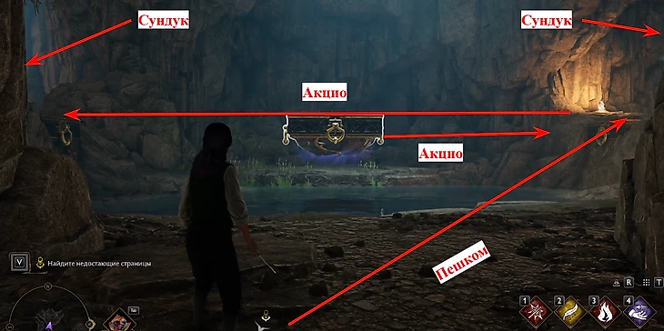 Шестой, седьмой и восьмой сундуки. Продолжайте идти вправо до пропасти с платформой. Двигайтесь на платформе в порядке, указанном на картинке. Справа вы найдете 2 сундука и паучью пещеру, слева один сундук.
