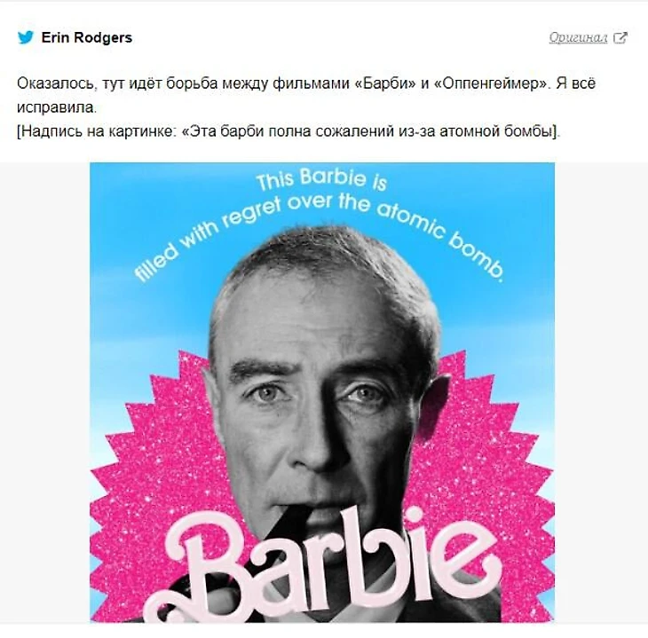 Мемы о «Барби» и «Оппенгеймере» создаются по тому же принципу.