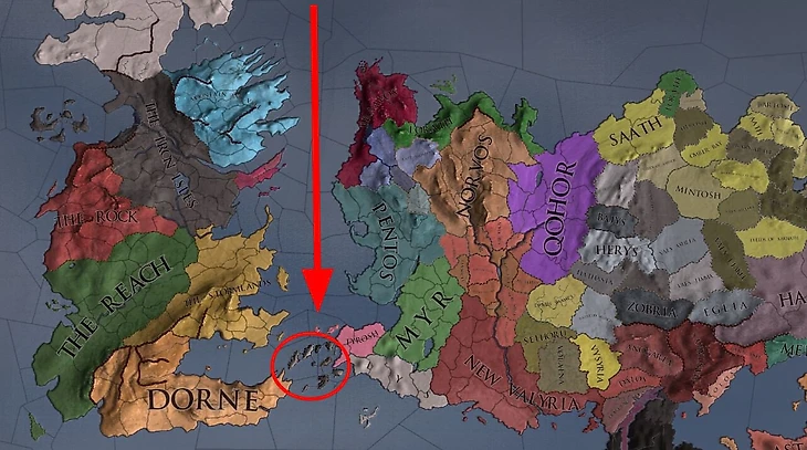 В восьмой серии второго сезона Тиланд Ланнистер от лица принца-регента Эймонда Таргариена стремится заключить союз с Триархией. Зеленые надеются, что флот конфедерации вольных городов поможет пробить блокаду Королевской Гавани. Магистры соглашаются помочь в обмен на возвращение Триархии власти над Ступенями, группой островов в Узком море.